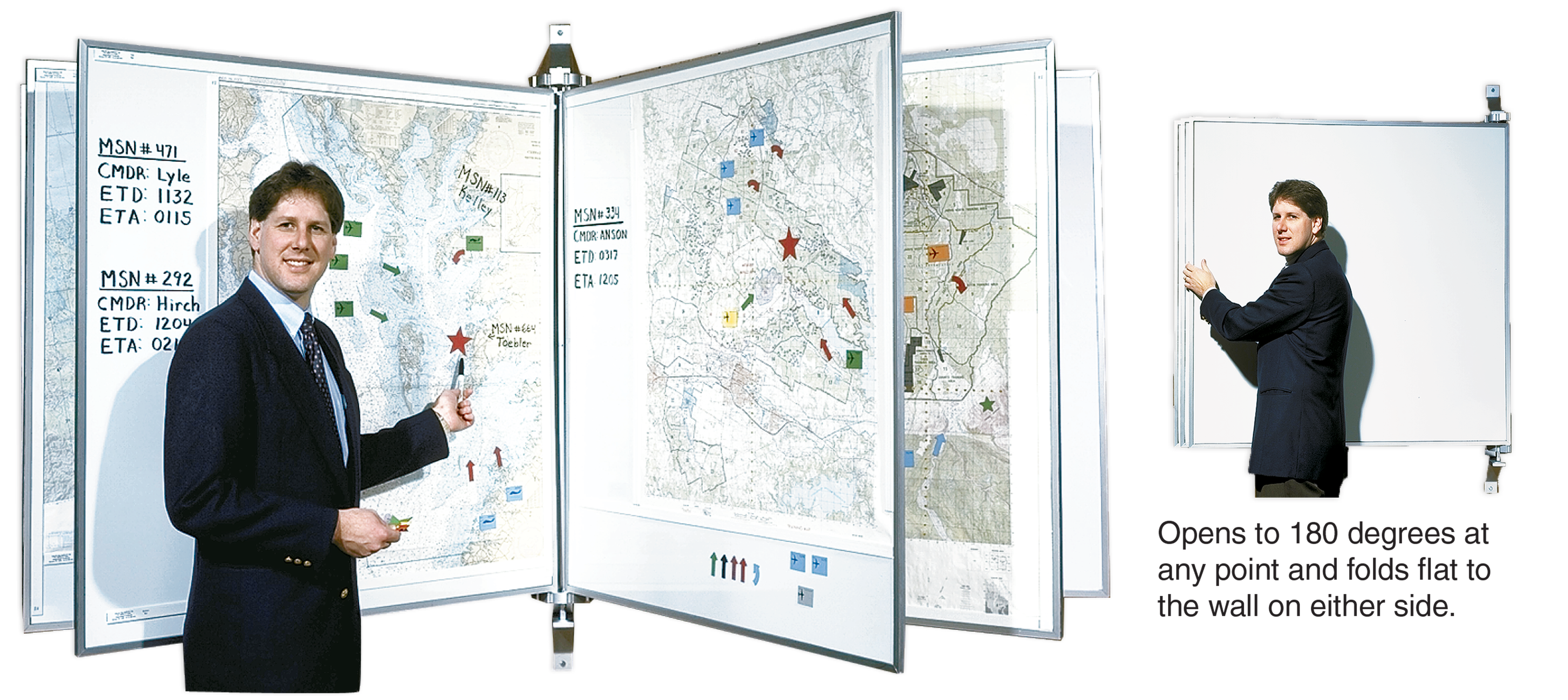 Opens to 180 degrees, (flat to the wall) at any point. Panels lift out and are interchangeable. Closes flat to the wall on either side. Holds six 2-sided hinged steel SwingPanels displaying up to 12 maps or other graphics, and is offered in 5 panel sizes from 2 x 3' to 4' x 4' and includes 12 magnetic MapMount® laminating sets with write-on clear film overlays, magnets and supplies for animating your maps. Change maps easily: The laminating is reversible without harming the map.