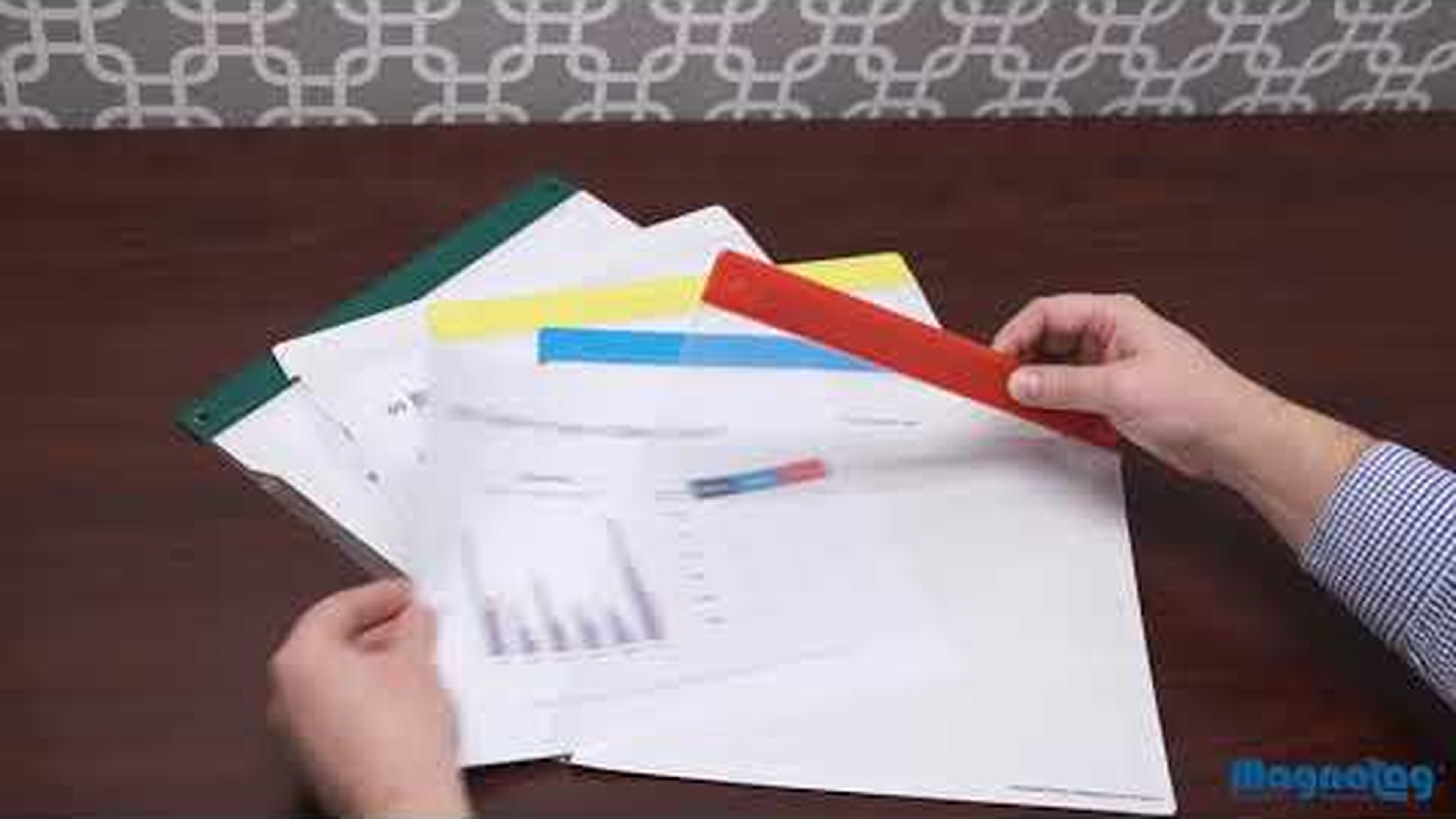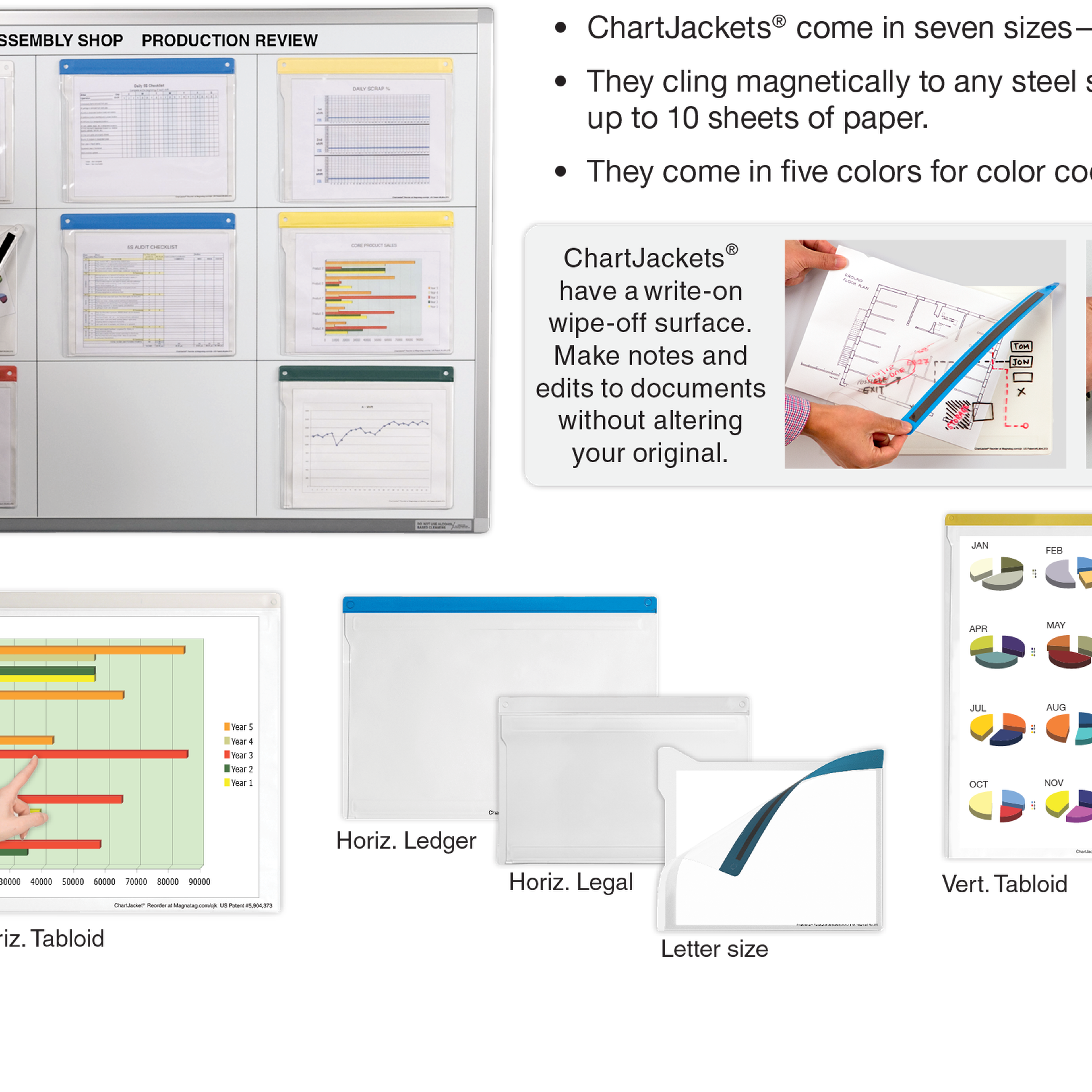 Easily and quickly insert, remove, change and neatly display letter, legal, ledger and tabloid size paper charts, documents and graphics in magnetic ChartJackets® without handling, soiling, dog-earing, creasing or wrinkling. Display them on magnetic steel whiteboards, or other steel surfaces. They also have posting holes for tacking them on cork boards and are great for transporting papers without folding or handling. Each holds up to 10 sheets.