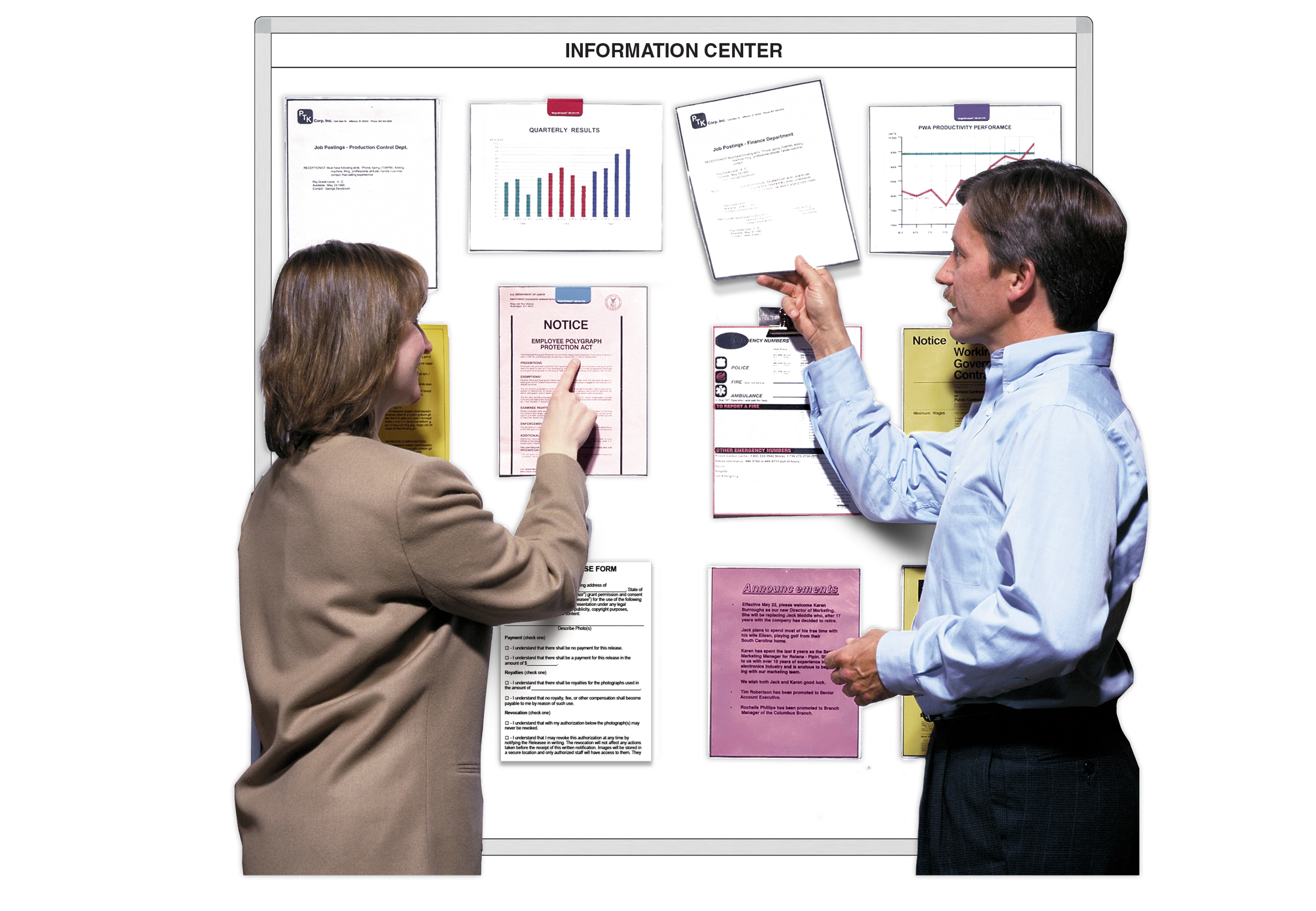 Employee notices, safety, OSHA and other bulletins can be quickly displayed on this board in magnetic clear vinyl document display Magnetic CardJackets™in 3 sizes that stay clean and dust-free. Kit also includes MagnaSnap® patented multi-page magnetic note holders, ceramic tack magnets and magnetic SuperClips™ for large and multi-page notices. They're fast and easy to reposition and rearrange so your NoticeBoard™ always stays neat and presentable. Write on the dry-erase whiteboard, too in 4 colors.