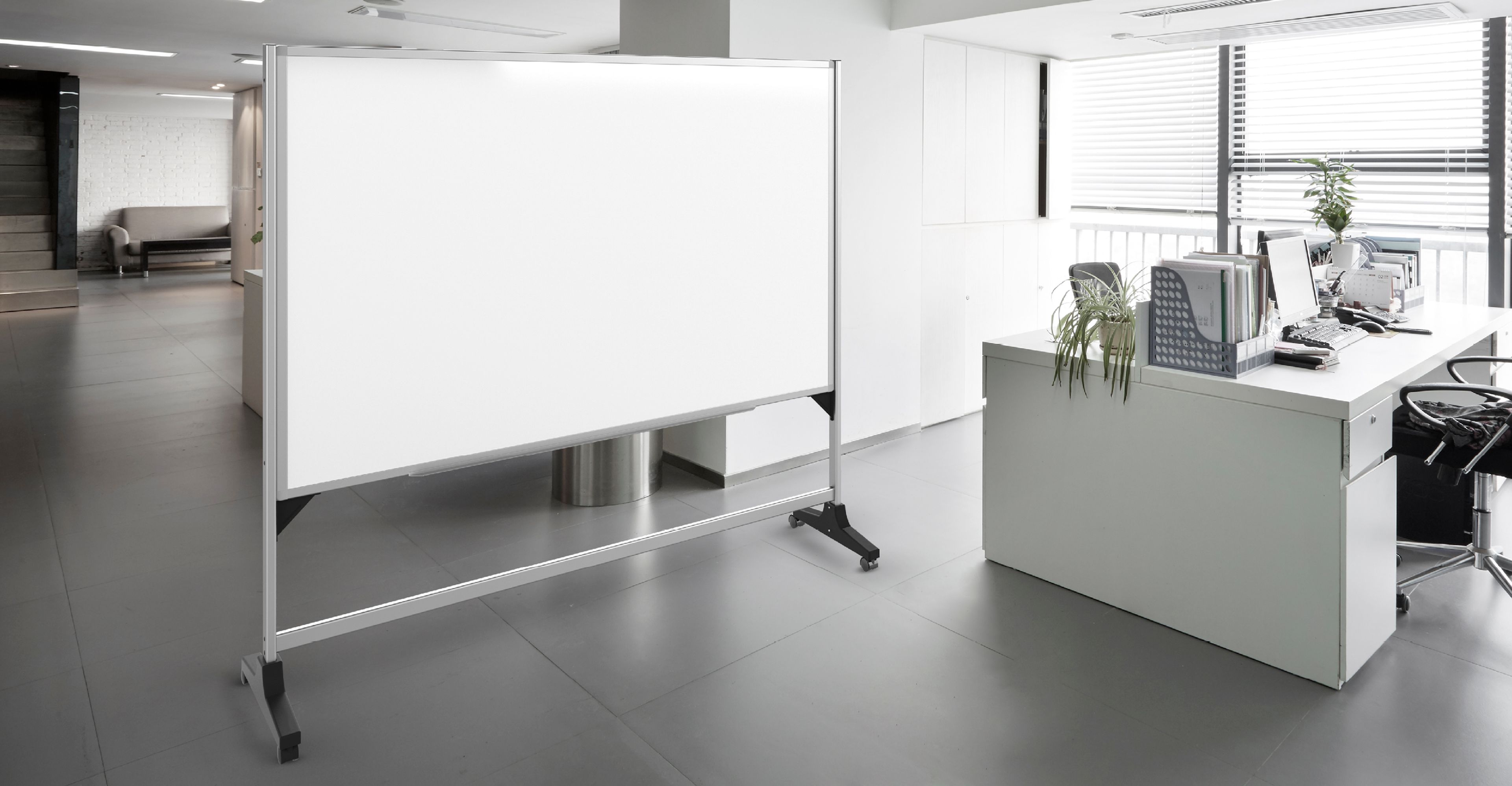 MagnaLux® porcelain-like steel plain whiteboard on one or both sides. These whiteboard stands do not pivot.