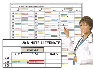 Board designs show patient appointment information for therapists and staff plus facility and equipment usage updates.