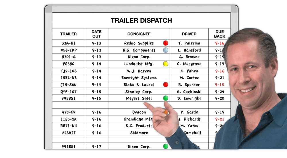 Tracks trailers: date out, consignee, driver and when due back. 10 magnet signal colors show status. 3 Sizes for 25, 70 or 105 trailers