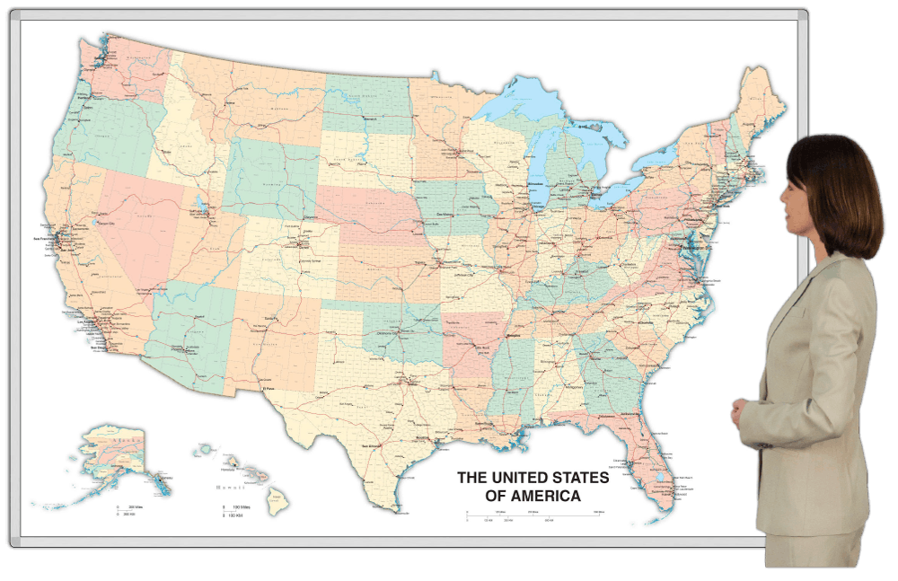 All of our permanently printed magnetic whiteboard US maps come in a wide array of sizes and four styles.