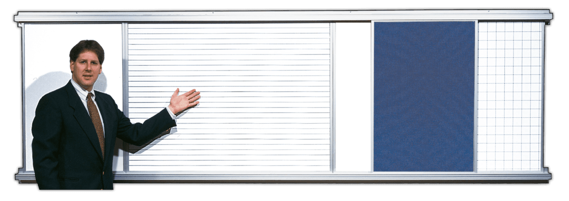 Convert your wall into a Visual Control Center. Displays 1 or 2 tiers of sliding magnetic whiteboards and or bulletin boards in tracks 2 rows deep. 5 widths: 76" to 216"
