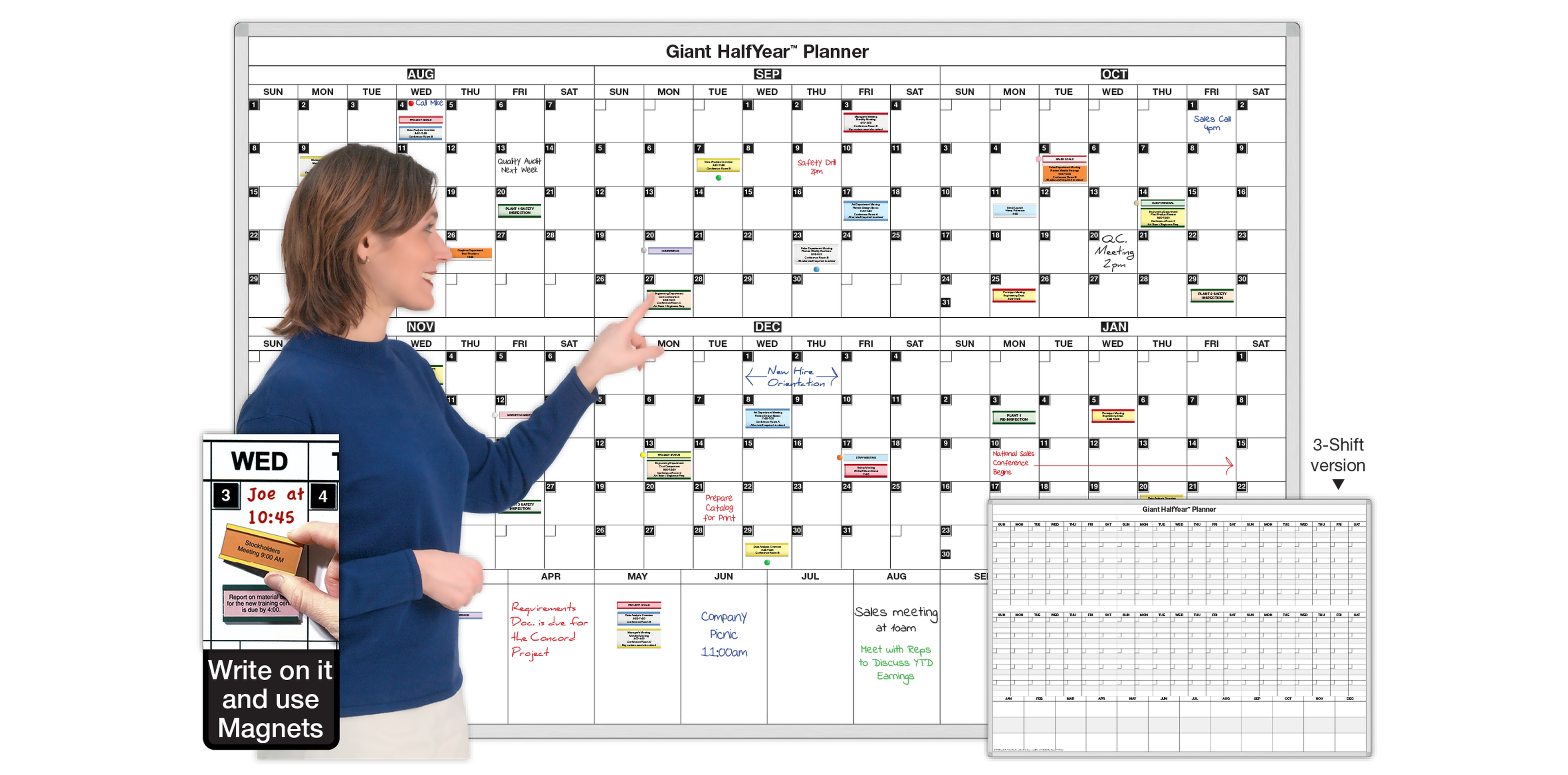 Use this 6 month daily planner to concentrate on daily activities while projecting and refining your plans and time commitments for the immediate future. There is also a 12 month section across the bottom of the board for longer range plans. Just move magnets to make changes. Write on the dry-erase whiteboard too in 4 colors. We offer it here in both full day 3-shift daily models.