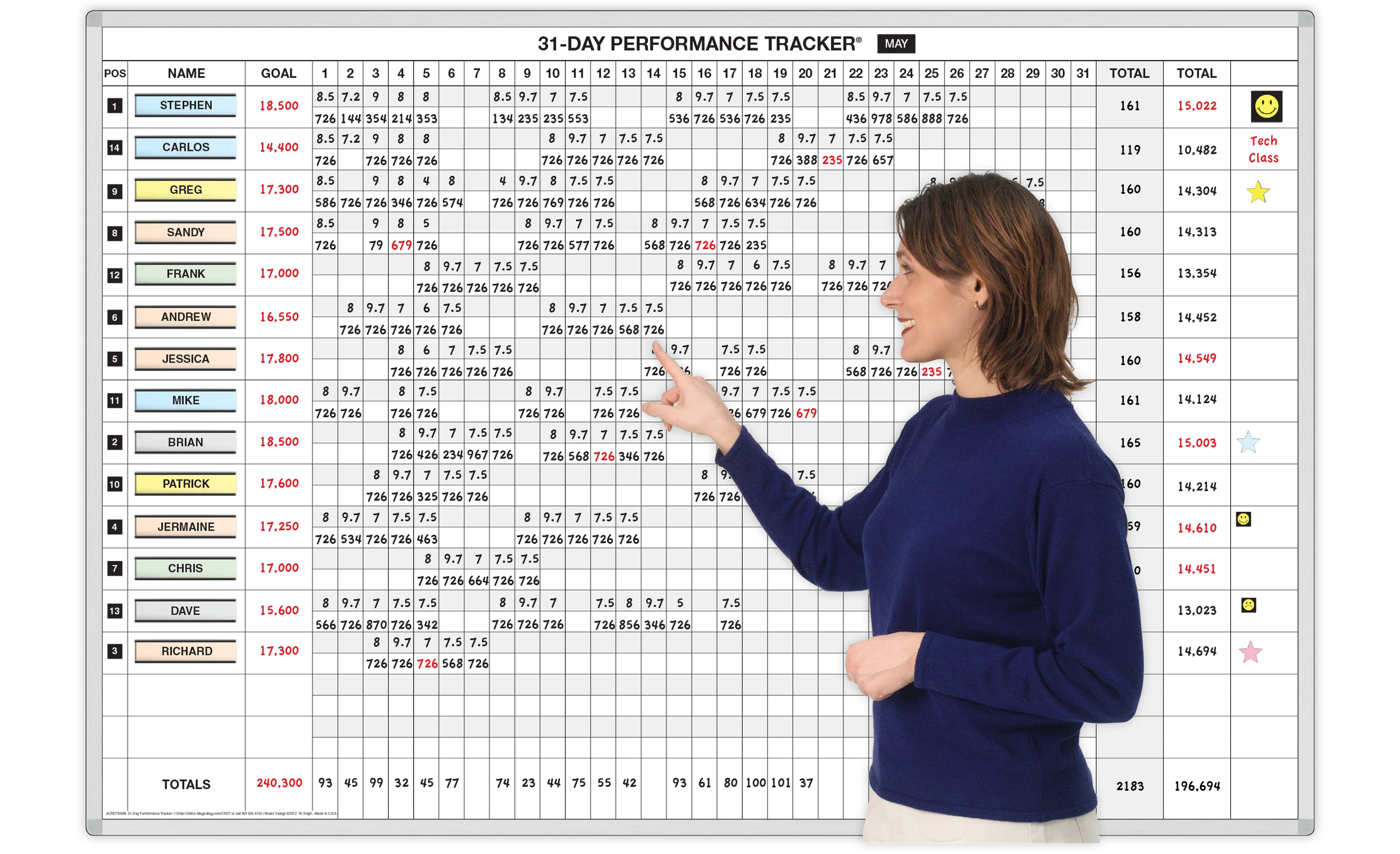 Each name or line-item has 2 rows (1 open and 1 shaded) across 31 day columns plus columns for monthly revenue goal, total performance and remarks. Use the shaded row to post goals, then post the performance generated that day on the second line. There is also a column for posting position (with magnetic position numbers) if you want to make a contest out of it. Write on the dry-erase steel whiteboard in 4 colors and use magnets too!