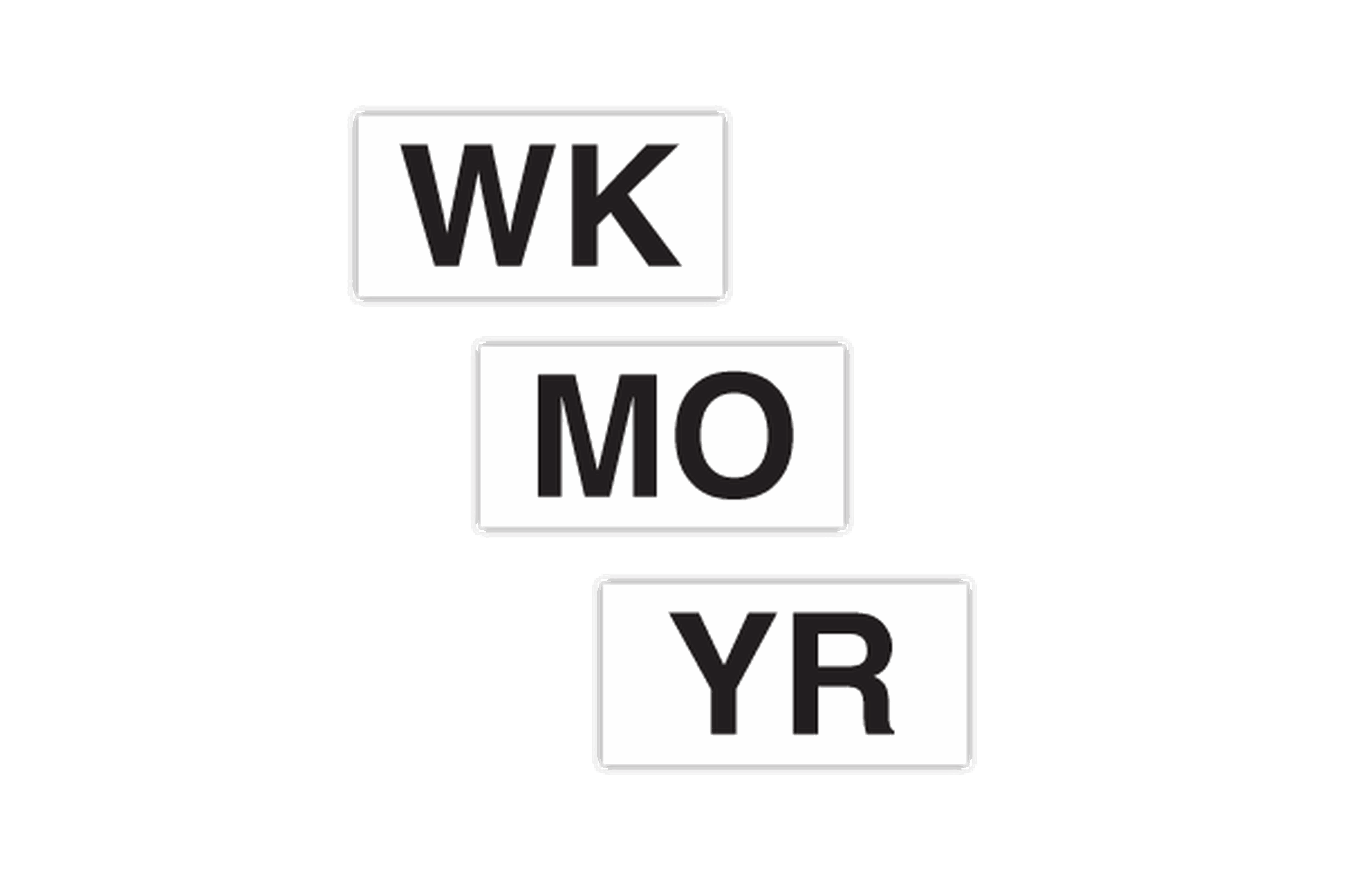 Set(s) of three 1-3/8 " x 2-1/4" printed magnets, WK, MO, YR, black on white
