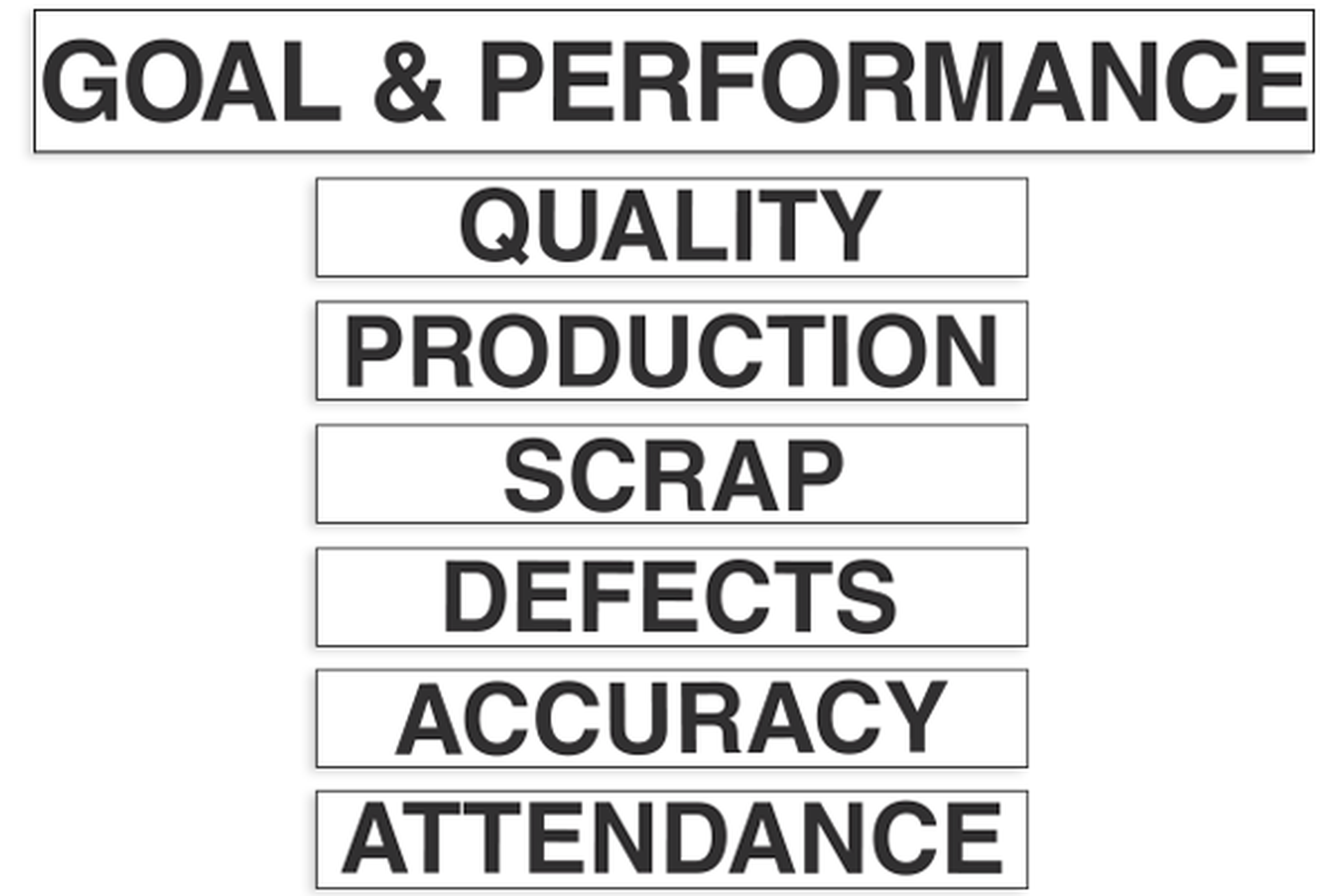 Set of six 1-3/8" x 10" printed production performance subject line title inserts (Quality, Production, Scrap, Defects, Accuracy, Attendance) & 2" x 18" master board heading insert (Goal & Performance).