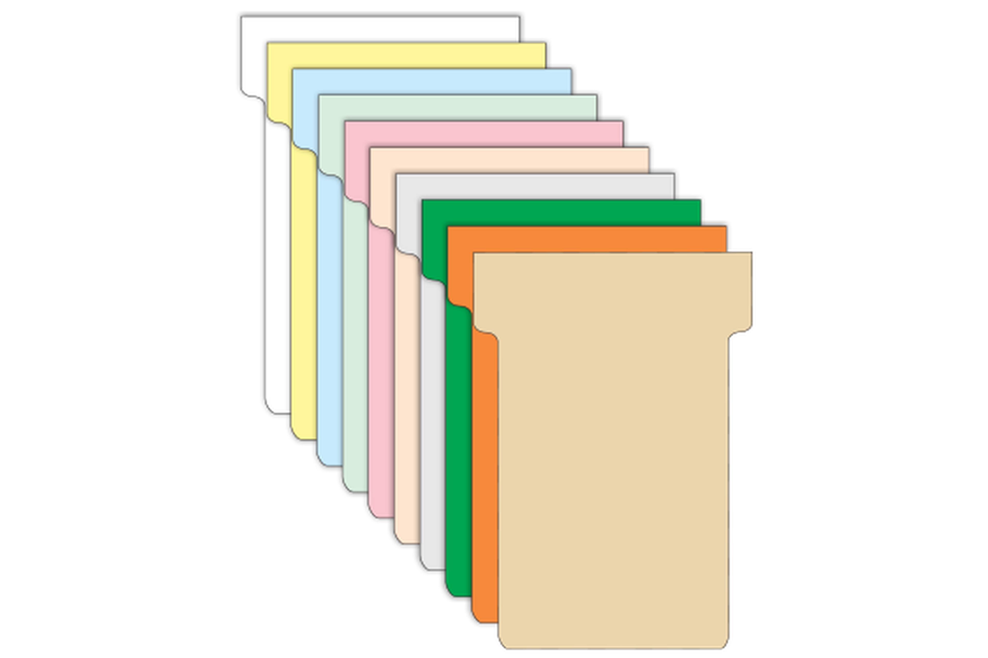 Package of 200 Die-Cut 5"h x 3-5/8"w T-Cards with 1/2" Visible tops, in 10 colors.