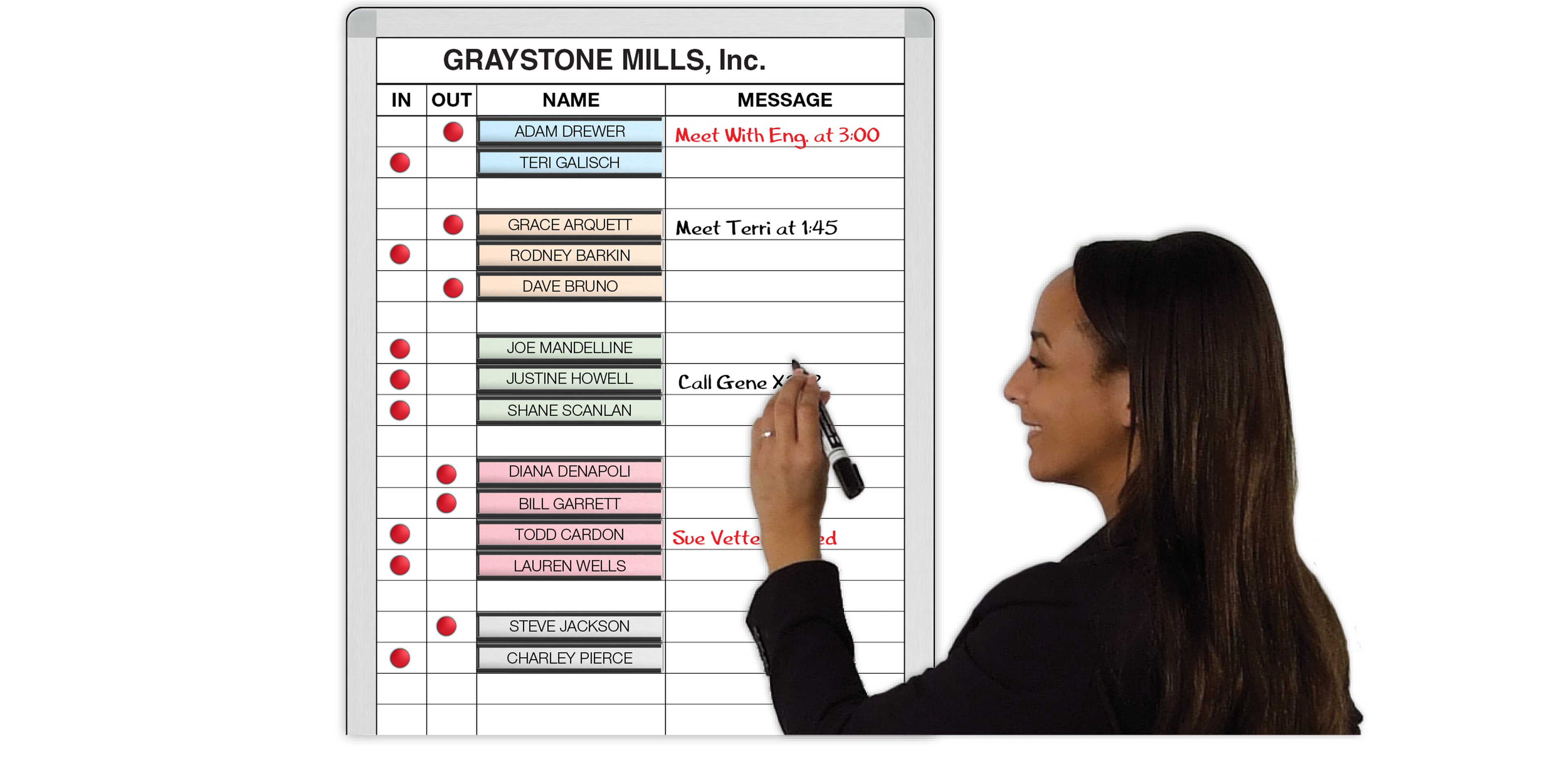 Place these In-Out boards in your staff entry-exit area in view of the receptionist. As each staff member arrives or leaves, they slide the red magnet circle indicator to the In or Out column and write an optional note on the board (destination, return, etc.), or receive a note on return (see Mary, etc.) One glance and everyone can see who is in, out and where or when. It's fast, simple, with no management oversight to maintain or update! Everybody on staff will come to rely on it.