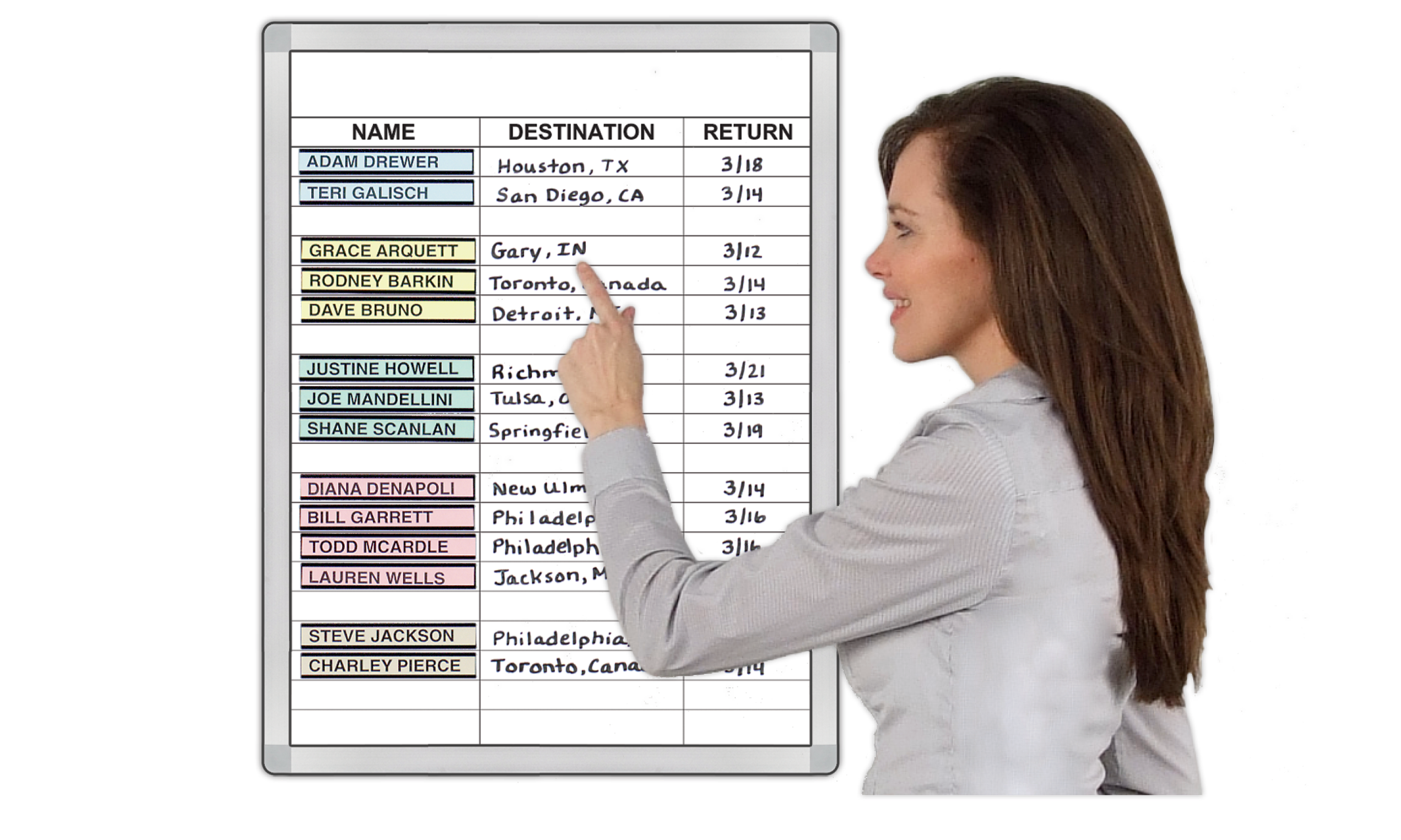 If you have people out and about your company business, this shows where they are and when you will see them again. 2 Sizes: 20 or 32 names