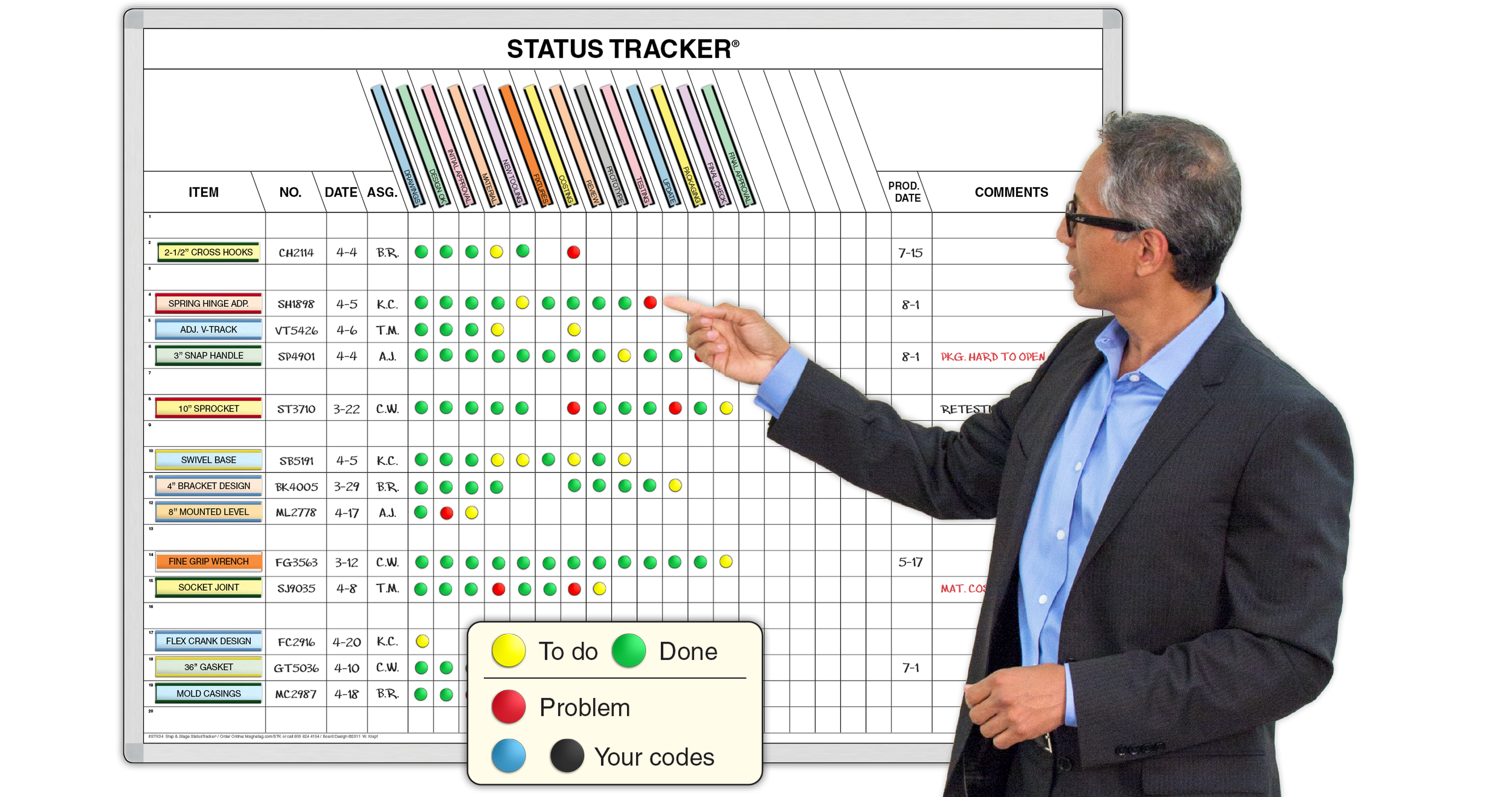This gives you a comprehensive up-to-the-minute performance picture. See your full operation; jobs, trainees, clients, project tasks etc. Magnet colors show To-Do, Done or Problem. 4 Sizes: 19 steps for 20 to 90 items