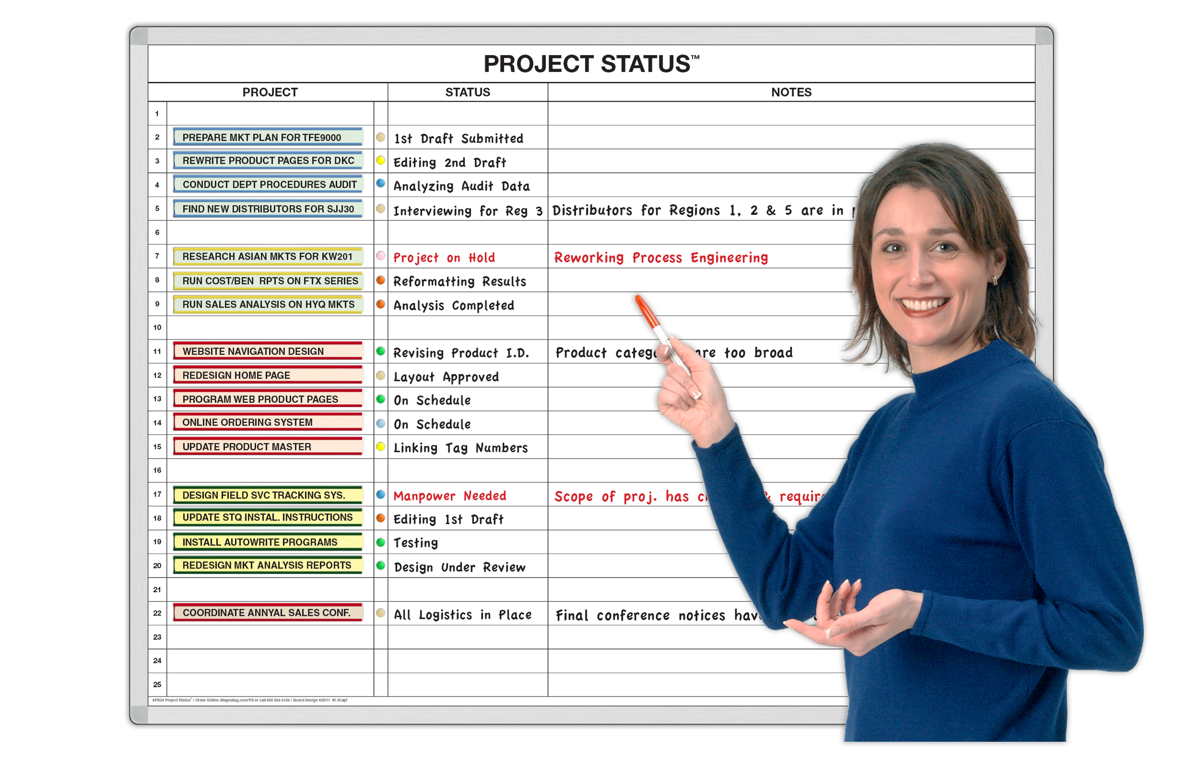 The most effective way to make sure everyone knows the situation is to just "tell it like it is". Do it here so all can see it 24/7. The beauty of this Project Management Status™ Whiteboard system is it can be as simple or as detailed as you need: You can post the project name using the long magnetic cardholders with as much data or as little as needed and can instantly reposition them for priority against the numbered lines. Also post magnetic status symbols in 10 color codes to flash trouble spots needing attention.